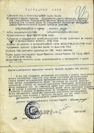 Мой прадедушка – Лукин Семён Ильич родился 1 сентября 1923 года. Когда началась война, моему прадедушке не было ещё 18 лет, но его всё равно забрали на учение в Свердловское высшее училище на командиров Красной Армии. Это училище он окончил с отличием, ему было присвоено звание лейтенанта. После окончания училища прадедушку отправили на фронт. Он участвовал на разных направлениях фронта. Но особо необходимо отметить Орловско – Курскую битву с 5 июля по 23 августа 1943 года. Это одна из крупнейших битв Великой Отечественной войны 1941-1945 годов. Вот здесь мужественно сражался артиллерийский полк из Ашхабада, в котором служил мой прадед. Он был командиром роты, проявил себя как умелый командир и опытный боец. За что был награждён орденом Красной Звезды. Также он участвовал в битве за Берлин. Благодаря умелым действиям моего прадедушки, его мужеству и отваге, атака противника была сорвана. За это он получил ещё один орден Красной Звезды. Мой прадедушка имел много медалей и даже личное поздравление от И. В. Сталина. Также он участвовал в параде Победы на Красной площади 1945 года. На родину в Ашхабад он вернулся только в декабре 1947 года. Но к большому сожалению, из-за боевых ранений очень рано умер, в возрасте 43 лет. Я очень горжусь своим прадедом, он настоящий герой!